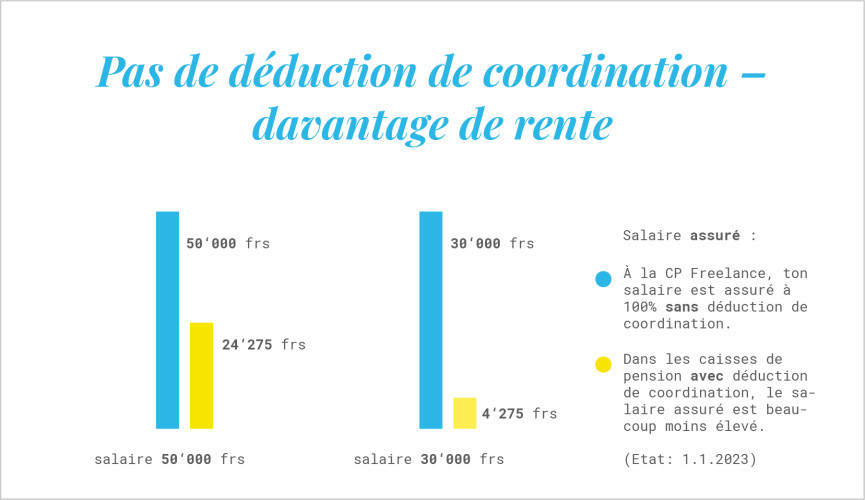 Chez nous, vous profitez d’une solution simple et souple, sans déduction de coordination. Ce qui signifie : votre salaire ou vos honoraires sont assurés dès le premier franc gagné. Cela entraîne des prestations d’assurance et des rentes nettement plus élevées que pour des caisses avec déduction de coordination. Pour le décompte des cotisations de prévoyance, nous collaborons étroitement avec les éditeurs et d’autres entreprises depuis des années, votre participation devenant ainsi minime.